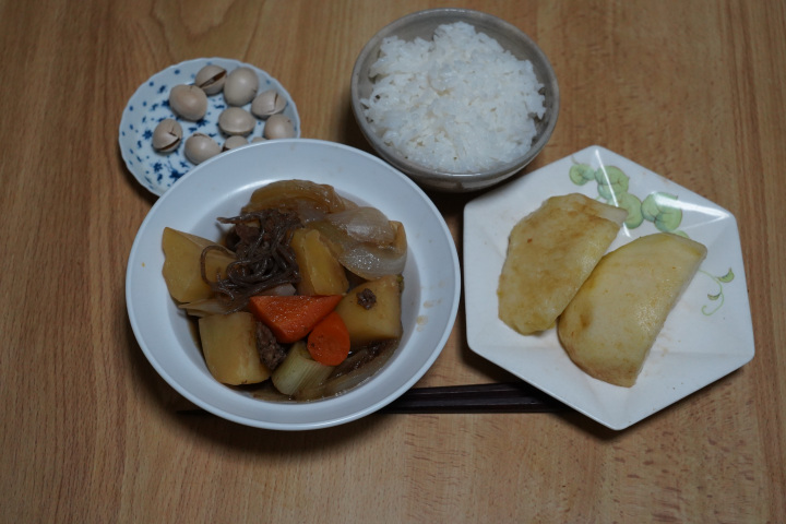里芋の煮っ転がしを作りましたが他のことに気を取られて煮過ぎてしまいました。食べられので良しとします。